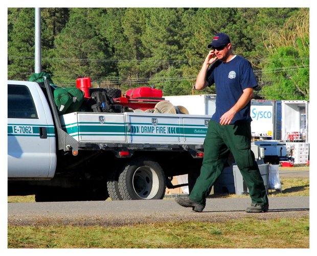 A wildland firefighter from the Bernalillo County (New Mexico) Fire Department talks to his kids on Father’s Day from the Little Bear Fire Base Camp in Ruidoso, New Mexico.