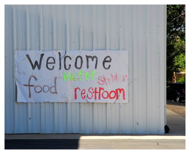 A sign on the side of a church building welcomes all effected by the recent forest fire… including fire-fighters, support workers, displaced residents, and others.