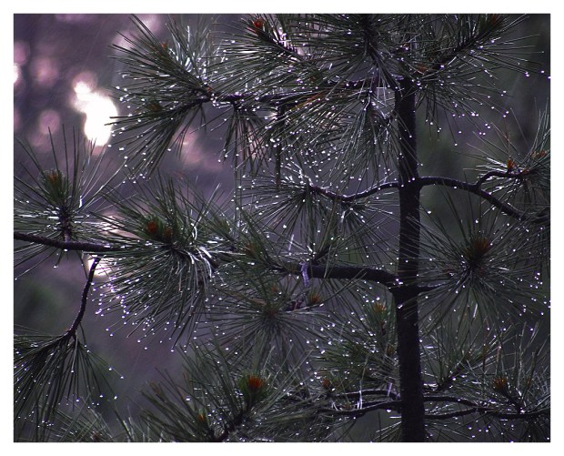 Water droplets sparkling in a pine tree during a heavy rain…