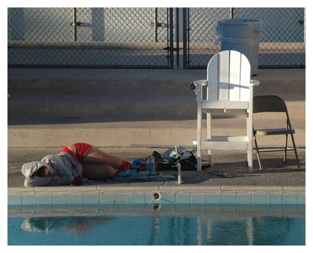 A merge of two opposing realities:  Safety… represented by the life guard station at pool-side… and danger… because the lifeguard is asleep.