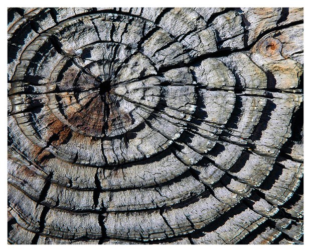 An over-head view of a parking lot bumper post reveals patterns of the years in the life of what was once a growing… vibrant tree.