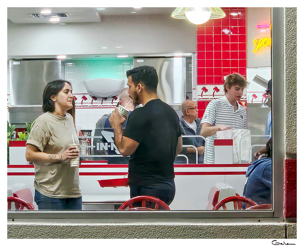 Candid photograph capturing a through the window moment inside a local In-N-Out. Tucson Arizona USA