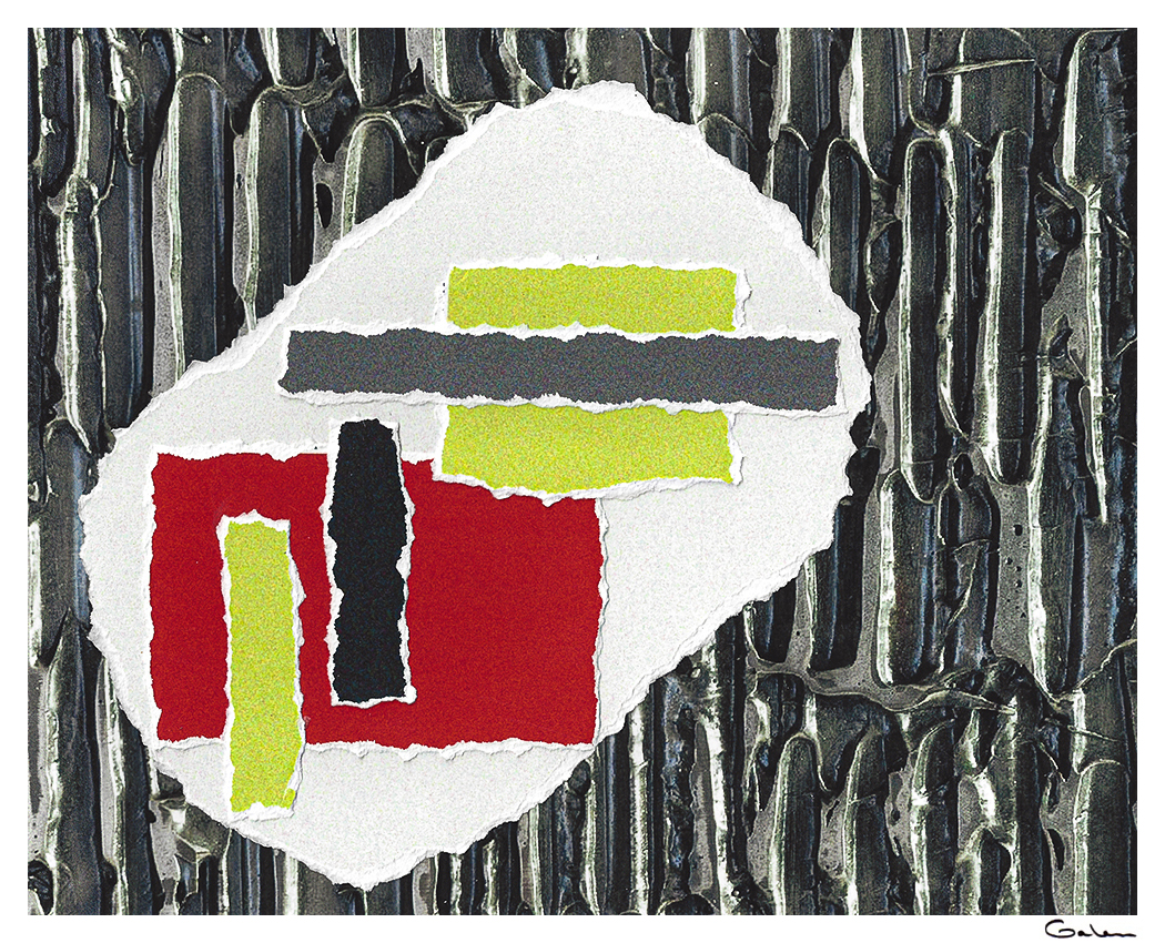 A minimal collage of torn paper arranged on a photograph of textured and cooled molten metal. The composition is meant to create a balanced interaction of shapes and colors with a strong abstract and modernist aesthetic.