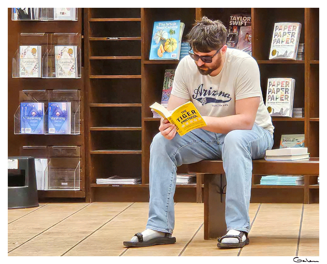 In a quest for normal day… a man sits engrossed in a health book at a local bookstore. Here is a sense of calm in an intellectual atmosphere… here is a quiet moment of contemplation in a casual and comfortable environment… here is the essence of normalcy. Photographed in Tucson Arizona USA.
