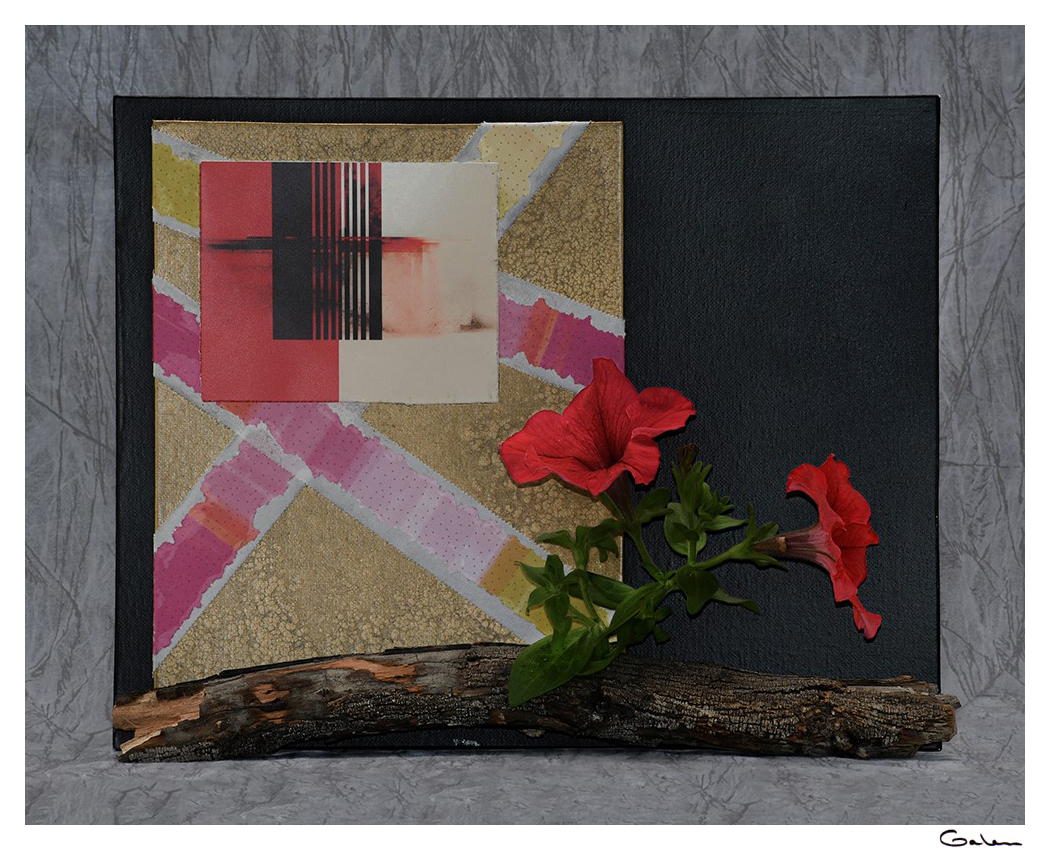 Mixed media collage with foreground of red petunias…